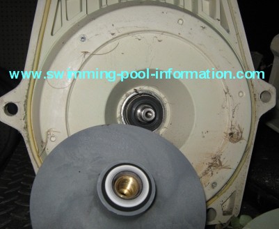 Below,a wrench to hold the shaft while impeller is screwed off-in this case by hand. Some motors are not as easy to get to the shaft-you must remove back motor cover and a capacitor to get wrench to shaft-there is a photo of that type of motor in motors section. Below that the impeller is removed,revealing shaft pump seal. You can use a channel locks wrench to remove impeller,but be careful not to damage impeller-sometimes putting a rag on over impeller before using wrench or just buying an impeller wrench from your local pool store is a good idea.